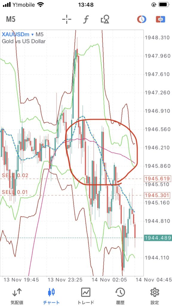 ゴールドの短期トレード 2023年11月14日 by genesabroo ゴールドをショートしてみました。 昨晩の急な上げの後、下げてます。 そんな中、反発しそうで上値が重いかなと 赤丸のところでショートを考えてエントリー。 今のところ移動平均線で落ちてくれてます。 ただ、ゴールドなので…どうなるか??