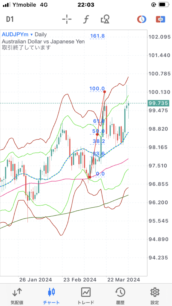 これでダブルボトムや逆三尊が出れば、日足のフィボナッチ161.8いくかな?と。